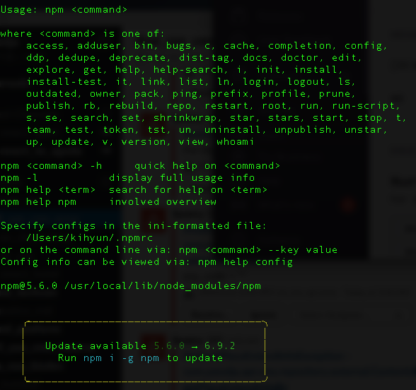 ๋ง์ง๋ง์๋ ์น์ ํ๊ฒ๋ npm ํ์ฌ ๋ฒ์ ์ด ๋ฎ์ผ๋ ์ต์ ๋ฒ์ ์ผ๋ก ์ ๋ฐ์ดํธํ๋ผ๋ ์๋ด ๋ฌธ๊ตฌ๊ฐ ๋์ค๋ค์.