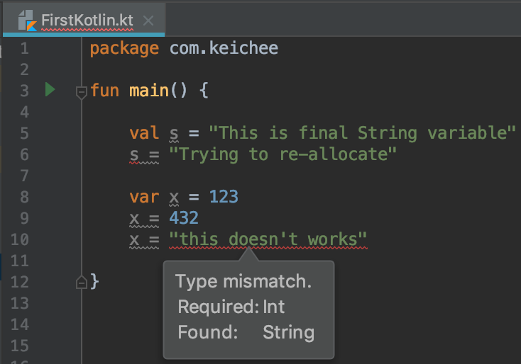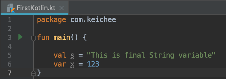 - ์๋ฐ๋ class ๋ธ๋ญ ๋ด์ main๋ฉ์๋๊ฐ ์กด์ฌํ์ง๋ง ์ฝํ๋ฆฐ์ ๋ฉ์ธํจ์๋ ํด๋์ค ๋ธ๋ญ๋ด์ ์กด์ฌํ๋ ๊ฒ์ด ์๋๋ค.