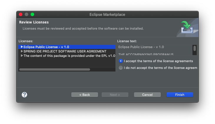 4. ๋ผ์ด์ผ์ค ๋์๋ฅผ ์ ํํ๊ณ Finish ๋ฒํผ์ ํด๋ฆญํฉ๋๋ค.