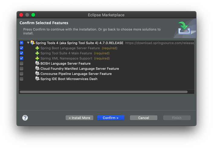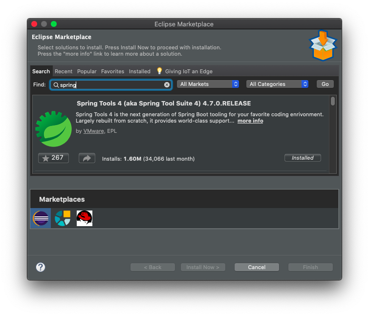 2. ๊ฒ์์ฐฝ์ spring ์ผ๋ก ๊ฒ์ํ ๋ค ์ ์ผ ์๋จ์ Spring Tools (aka Spring Tools Suite) ๊ฐ ๋ณด์ด๋ฉด install ๋ฒํผ ํด๋ฆญ (2020๋ 7์ ํ์ฌ ์ต์ ๋ฒ์ ์ 4.7.0.RELEASE)