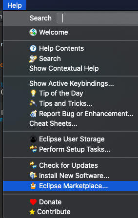 1. ์ดํด๋ฆฝ์ค ์๋จ ๋ฉ๋ด์์ Help > Eclipse Marketplace... ์ ํํฉ๋๋ค.