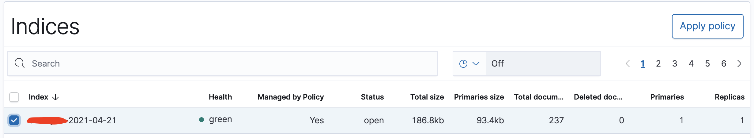 ๋ชฉ๋ก์์ ํ๋ ์ด์์ ์ธ๋ฑ์ค๋ฅผ ์ ํํ๋ฉด ์ฐ์๋จ์ Apply policy ๋ฒํผ์ด ํ์ฑํ ๋ฉ๋๋ค. ๋ฒํผ์ ํด๋ฆญํ๋ฉด ์ ์ฑ ์ด ๋ฐ์๋๊ณ ์๋ก๊ณ ์นจ์ ํด๋ณด์๋ฉด Managed by Policy ๊ฐ์ด No ์์ Yes๋ก ๋ณ๊ฒฝ๋ฉ๋๋ค. .kibana ์ธ๋ฑ์ค์ฒ๋ผ ์ ๋ชจ๋ฅด๋ฉด ๊ฑด๋ค์ง ๋ง์์ผํ๋ ์ธ๋ฑ์ค๋ค๋ ์ฌ๊ธฐ ๋ชฉ๋ก์ ์กฐํ๊ฐ ๋๊ธฐ ๋๋ฌธ์ ์ ์ฒด ์ ํํ์ฌ ์ ์ฑ ์ ์ ์ฉ์ํฌ ๋์๋ ๊ทธ๋ฐ ์ธ๋ฑ์ค๋ค์ด ํฌํจ๋์ด์์ง ์์์ง ์ ํ์ธํ์ ์ผ ํฉ๋๋ค. ๋ง์ฝ ์๋ชป ์ ์ฉํ๋ค๋ฉด ์ ์ฉ ์ทจ์๋ ๊ฐ๋ฅํฉ๋๋ค.