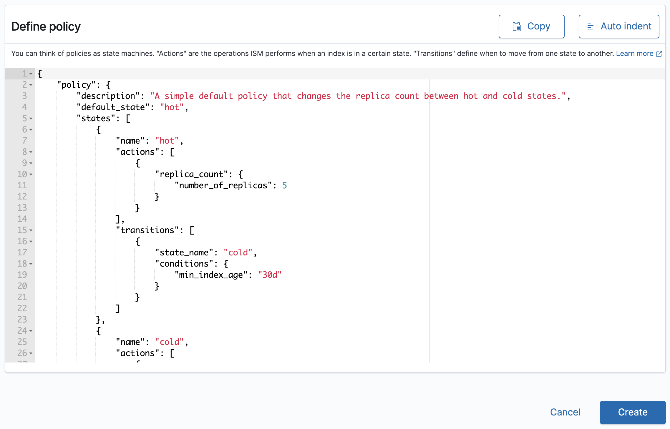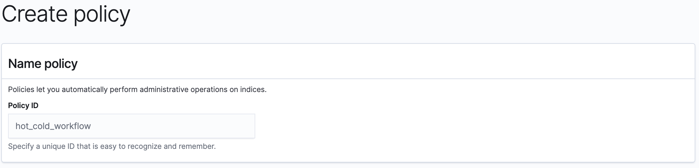 policy_id๋ Name policy์ ๋ช ๋ช ํด์ฃผ์๋ ์ด๋ฆ์ ๊ทธ๋๋ก ์ฌ์ฉํ๊ณ , default_state ๋ฅผ hot ์ด๋ผ๋ ์ํ๋ก ์ค์ ํด์ฃผ์์ต๋๋ค.