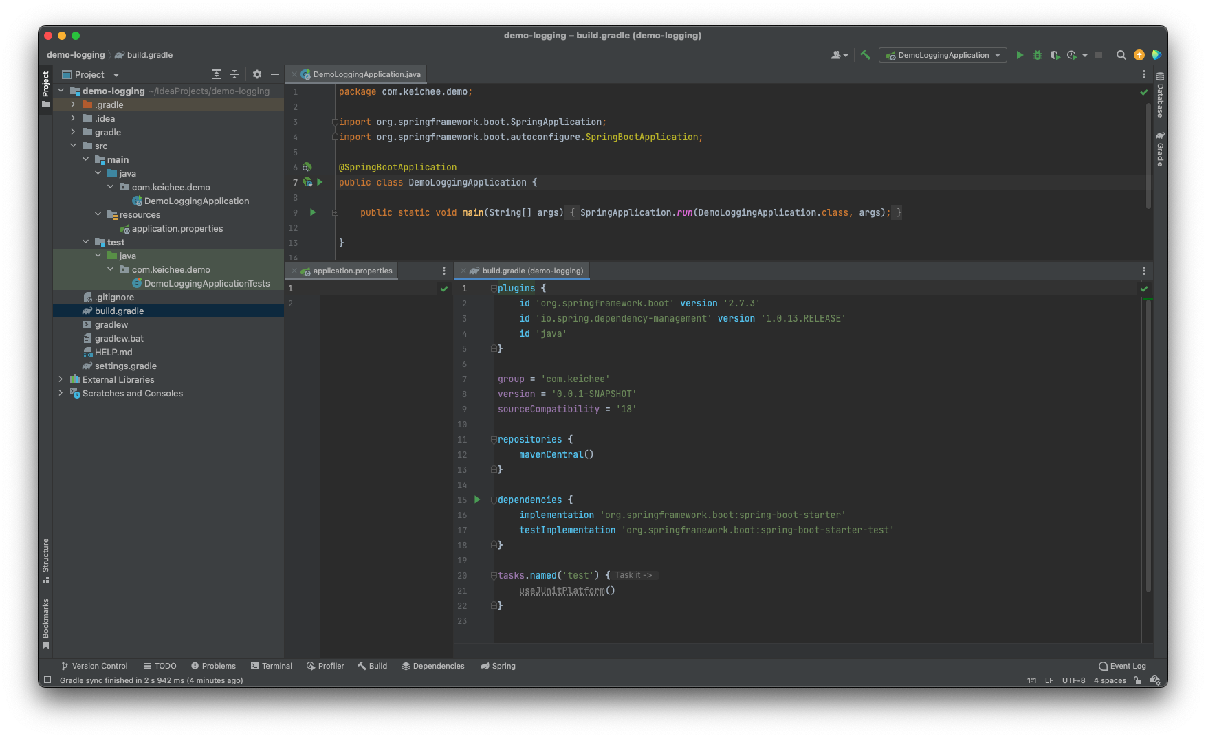 2022-09-16 10:04:37.416 INFO 57590 --- [ main] com.keichee.demo.DemoLoggingApplication : Started DemoLoggingApplication in 0.642 seconds (JVM running for 0.873)